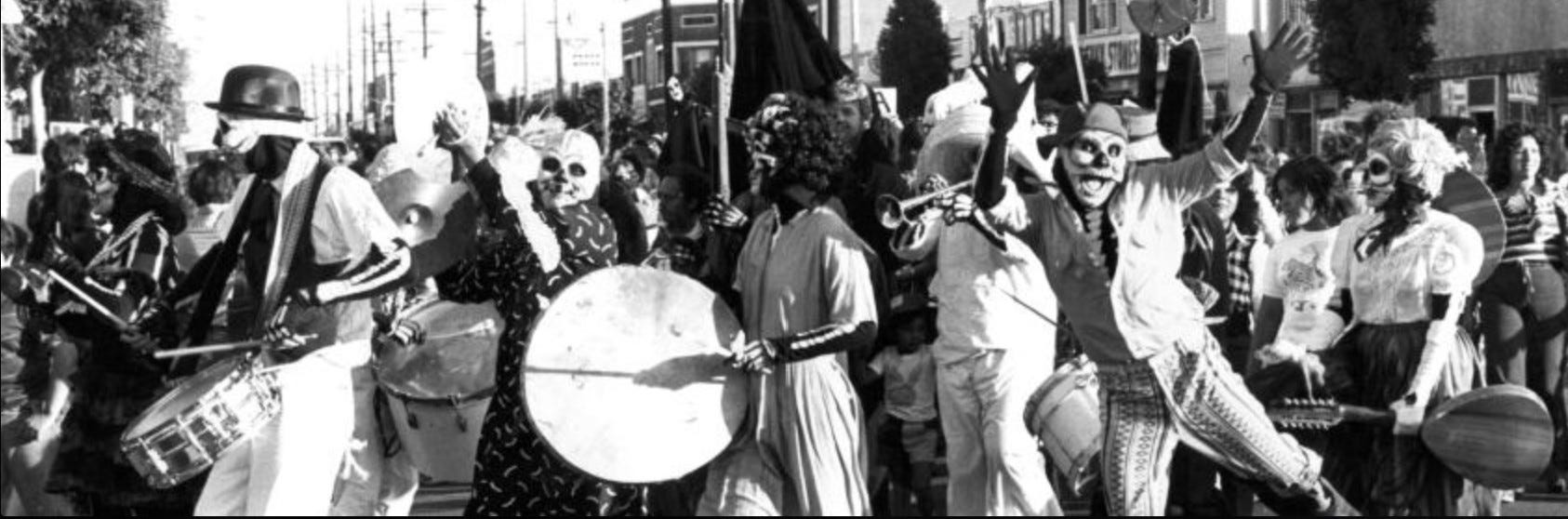 As noted in discussions of Chicano celebrations, the largest U.S. procession in San Francisco “has about 20,000 participants annually, at least half of whom appear to be non-Latinos...includes stilt walkers, jugglers, bagpipe players, steel drummers and political banners condemning human rights abuses, wars and other sociopolitical causes of death.”
