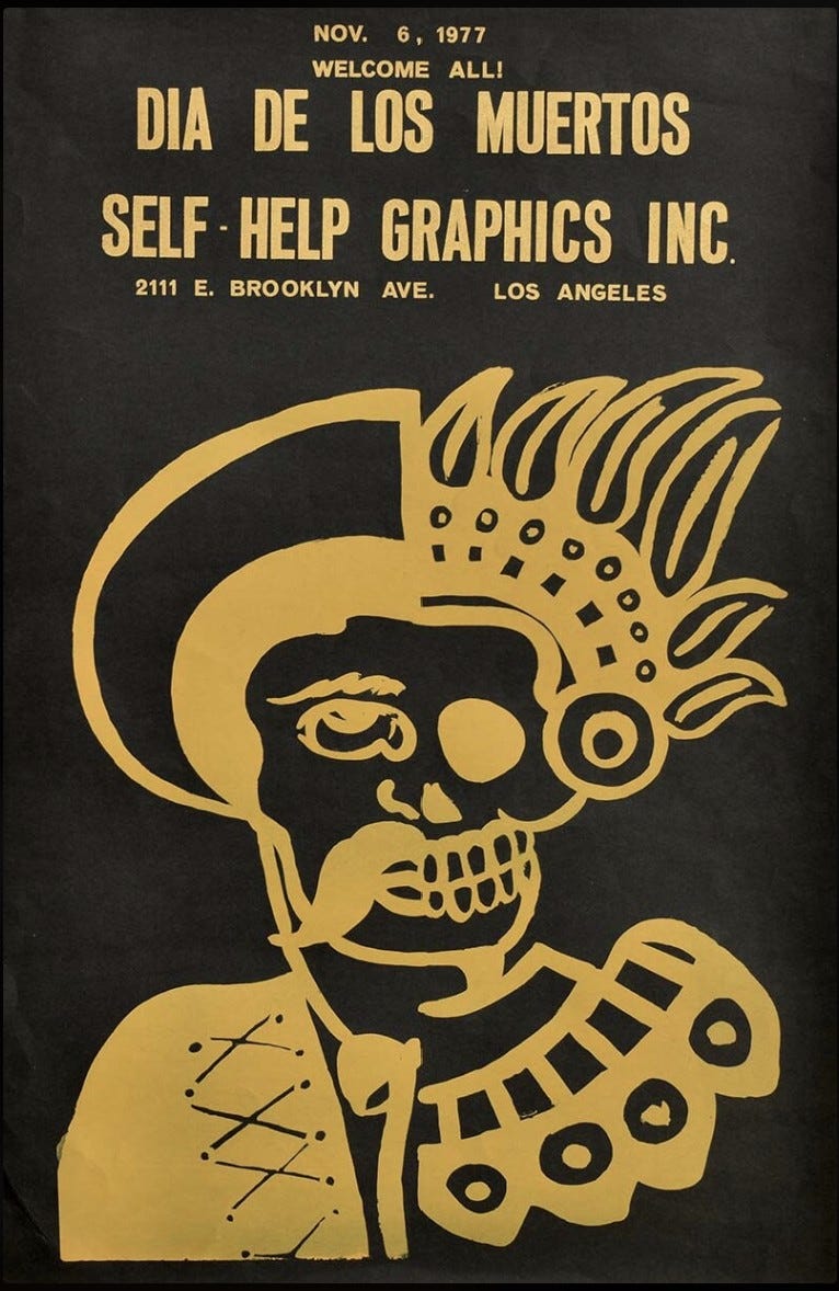 One of the first “modern” celebrations took place in 1972-1973 when a group of Chicano artists and activists in East Los Angeles, led by Self Help Graphics & Art (the oldest Chicanx art center still in existence), intentionally incorporated indigenous traditions back into the holiday with ofrendas, parades, costumes and artworks. Their parade notably ended at a cemetery with an altar to honor those killed by gang violence, blending ancient traditions with contemporary concerns facing the Chicanx community.